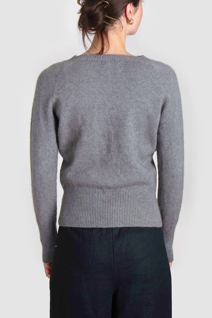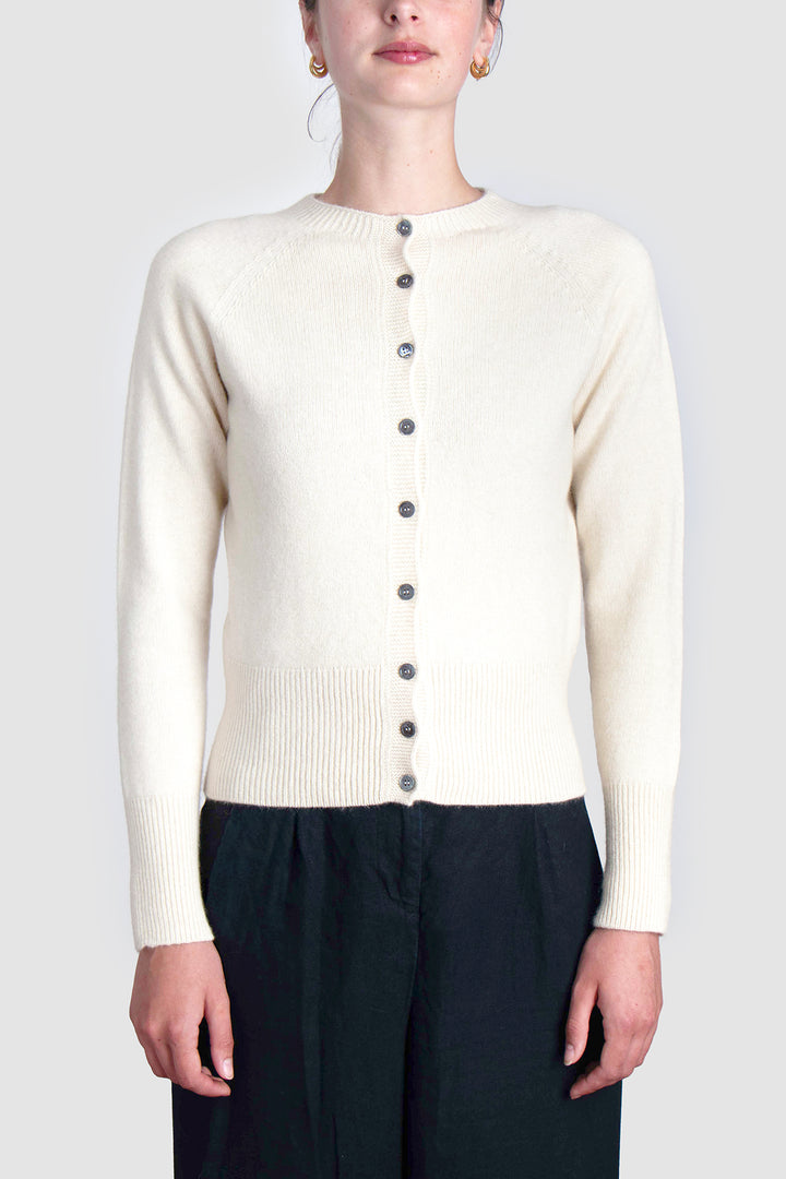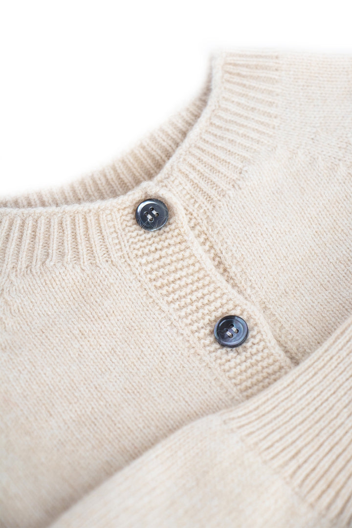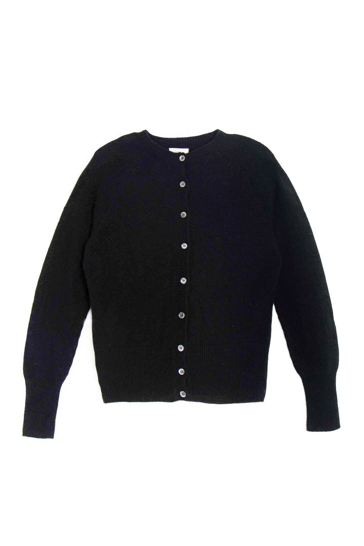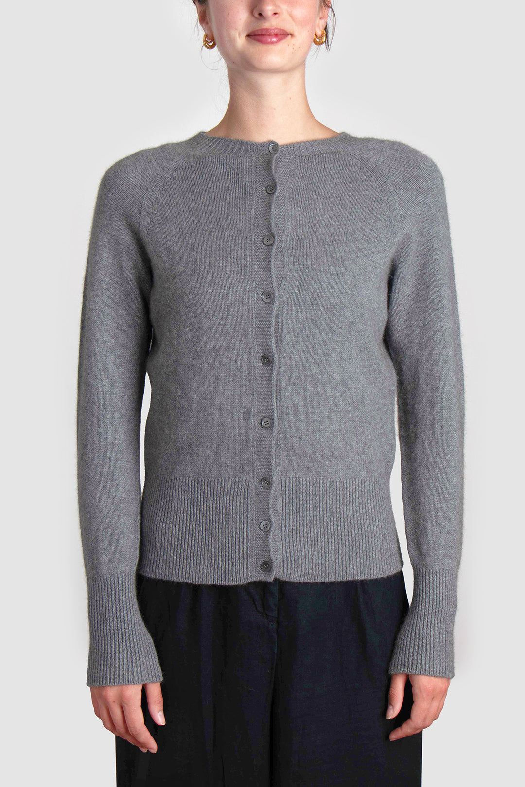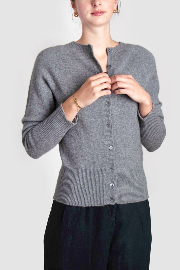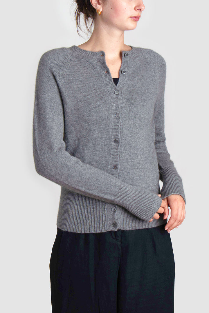 Delicate smoke-hued buttons line the front, complementing the classic crew neckline and adding a hint of understated charm. Whether worn open over a silk slip dress or buttoned with tailored trousers, this cardigan anchors the wardrobe with elegance and ease.