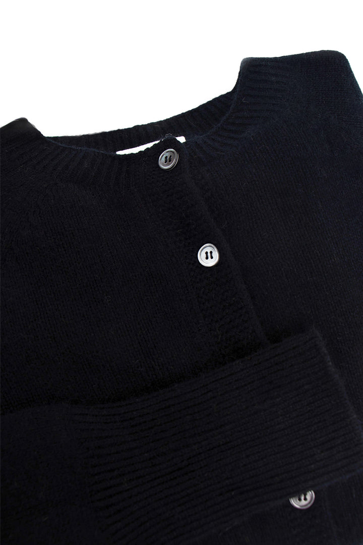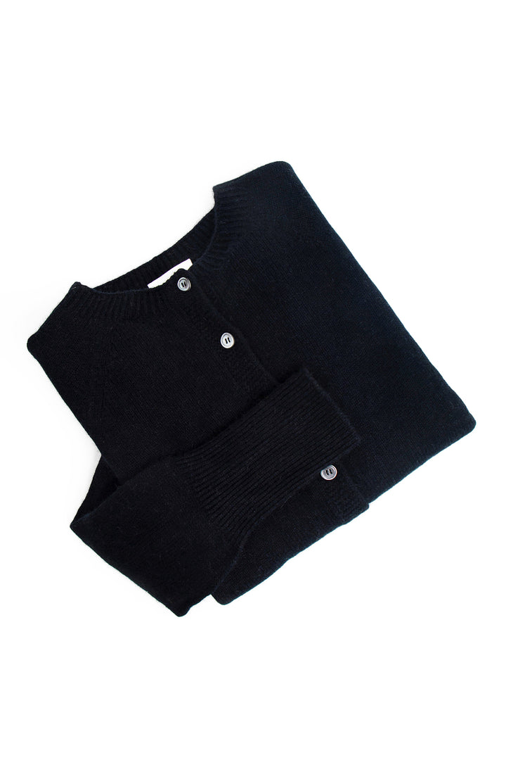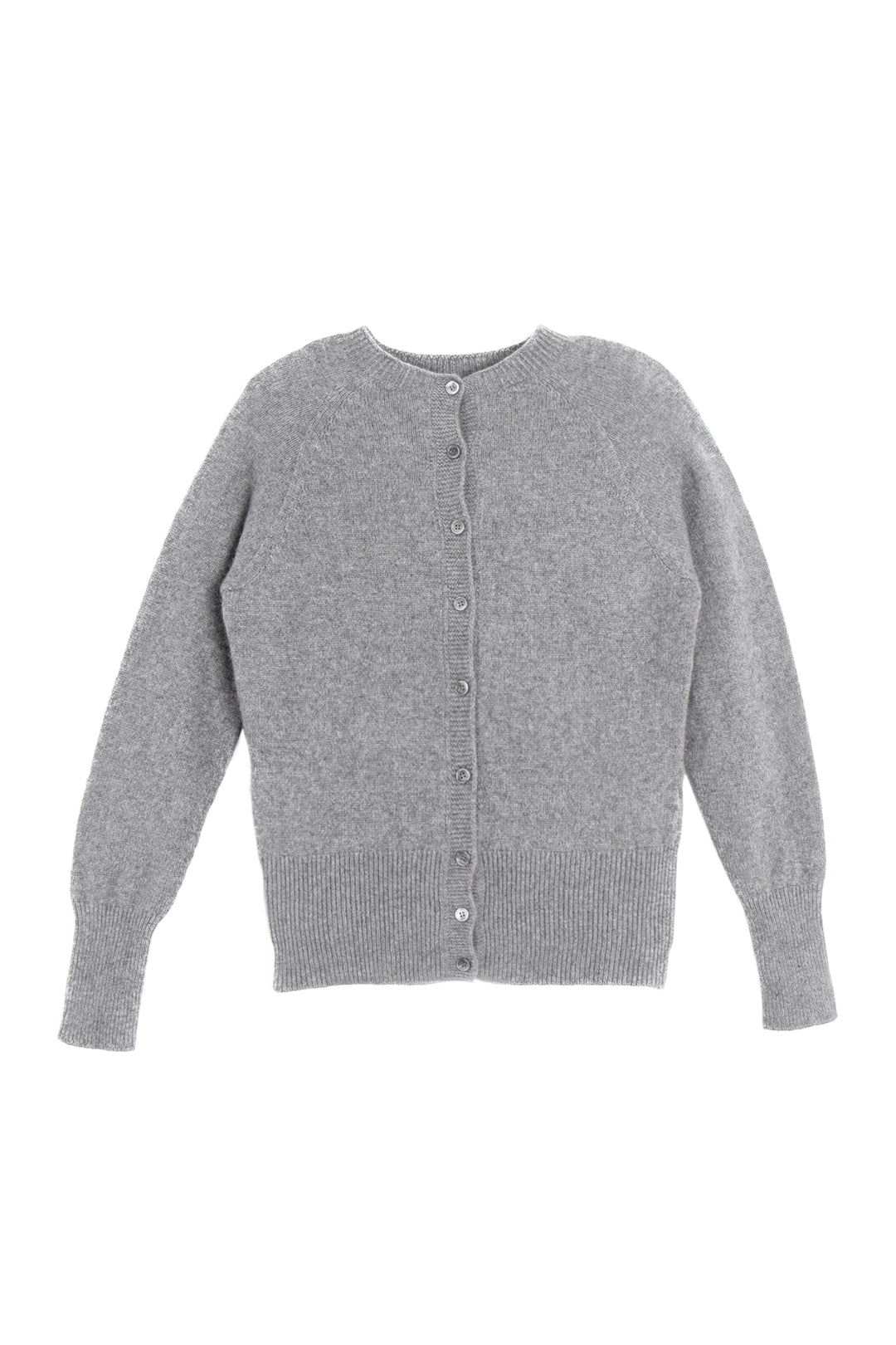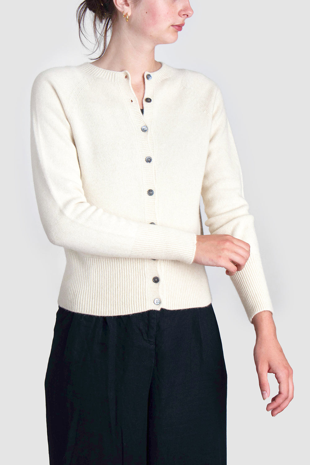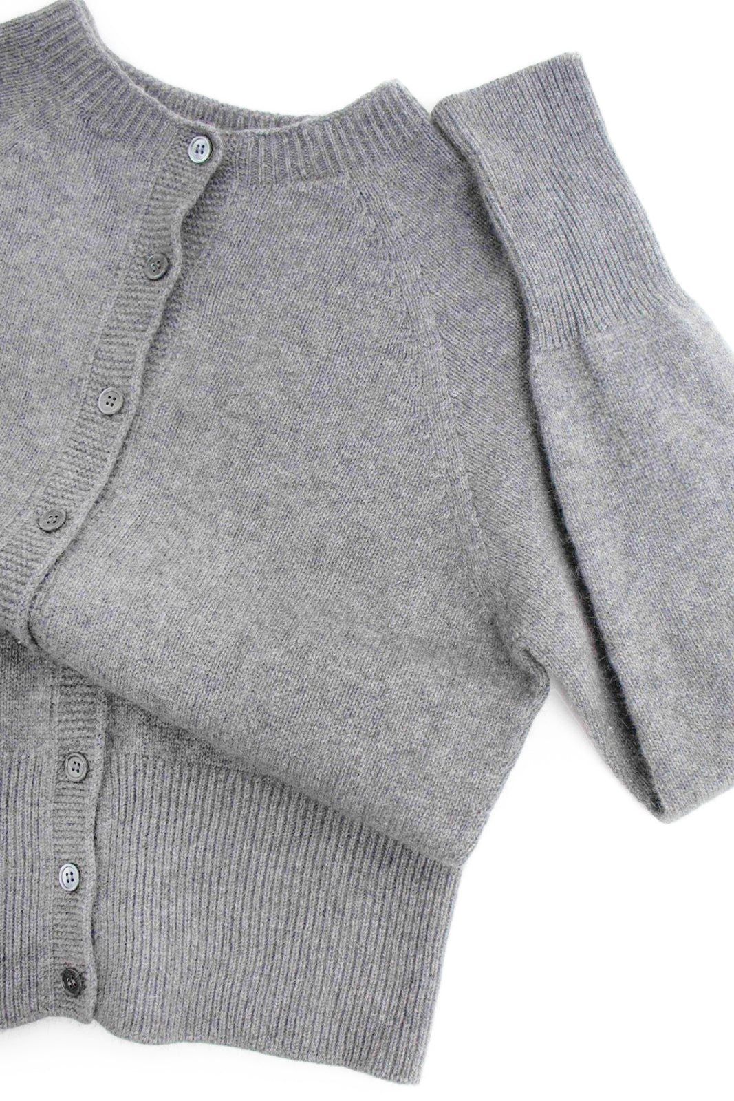 Delicate smoke-hued buttons line the front, complementing the classic crew neckline and adding a hint of understated charm. Whether worn open over a silk slip dress or buttoned with tailored trousers, this cardigan anchors the wardrobe with elegance and ease.