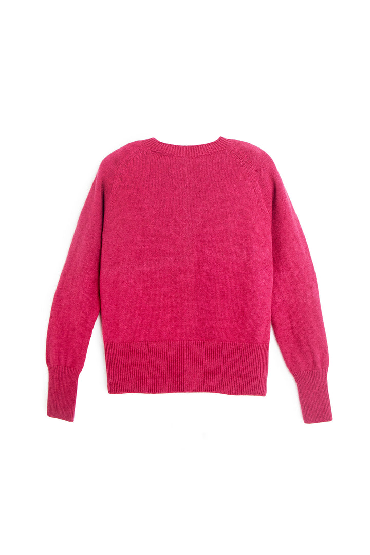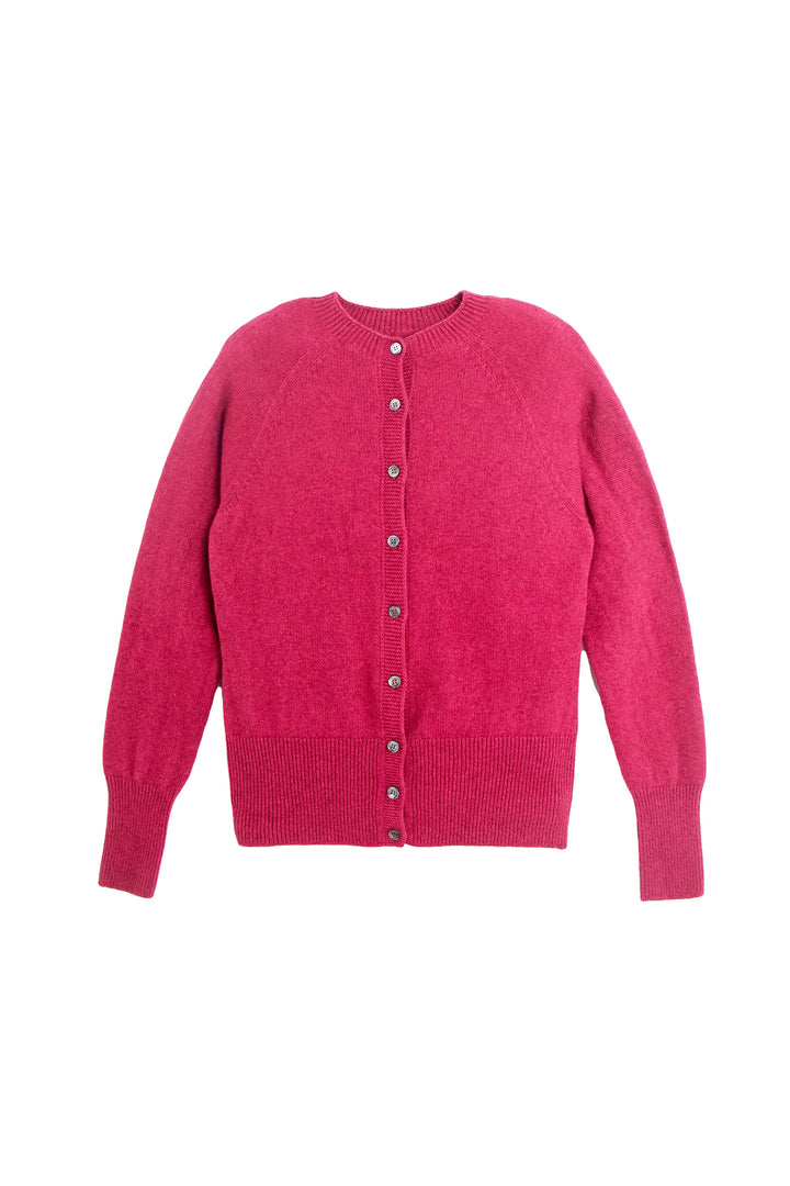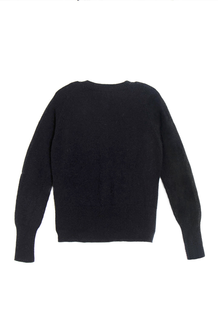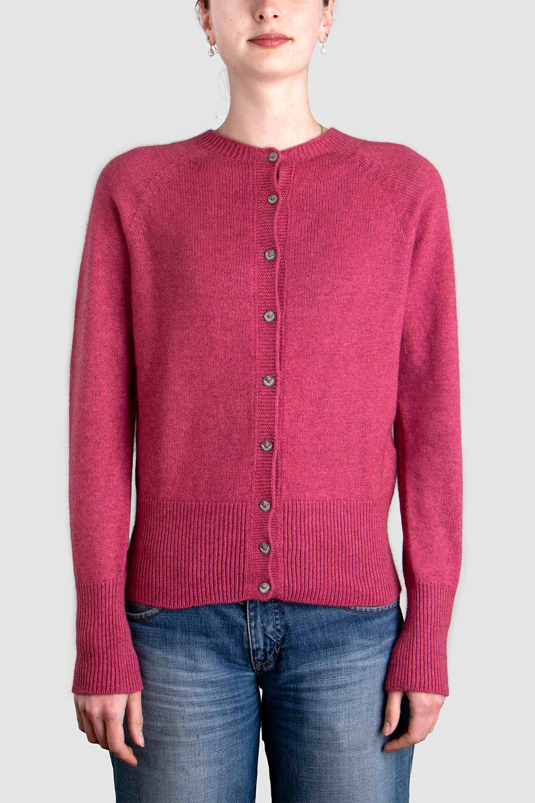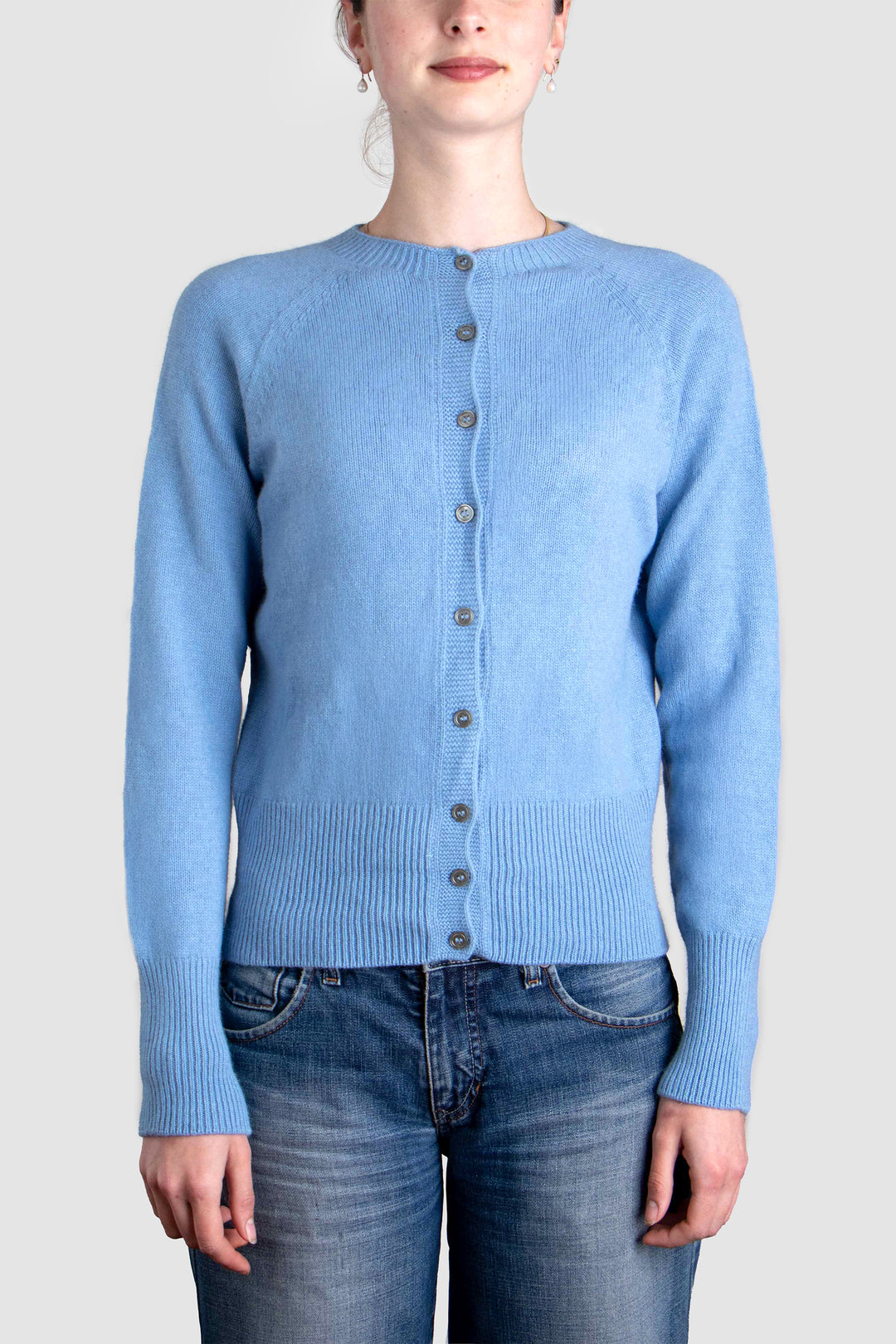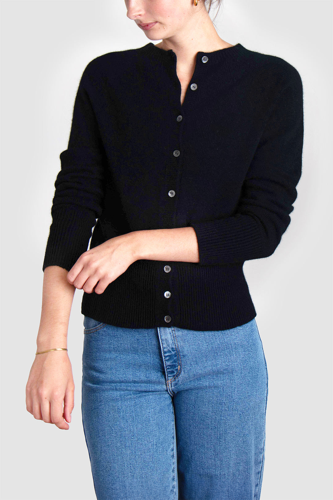 Delicate smoke-hued buttons line the front, complementing the classic crew neckline and adding a hint of understated charm. Whether worn open over a silk slip dress or buttoned with tailored trousers, this cardigan anchors the wardrobe with elegance and ease.