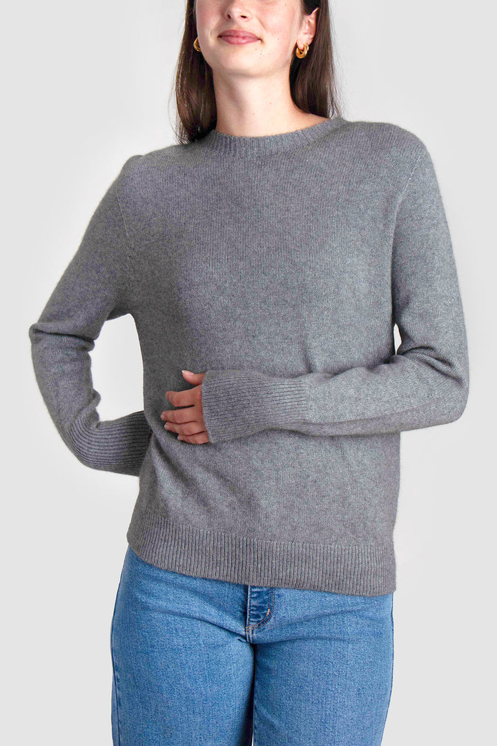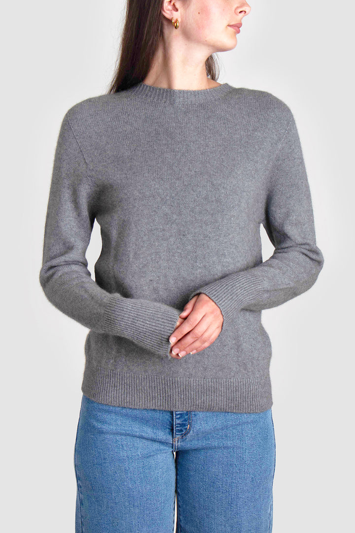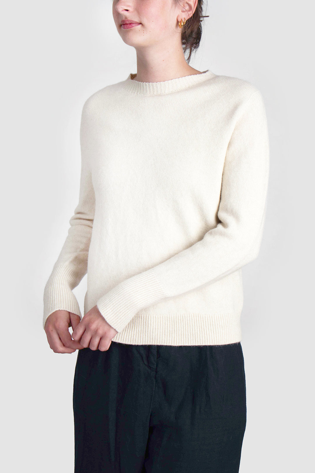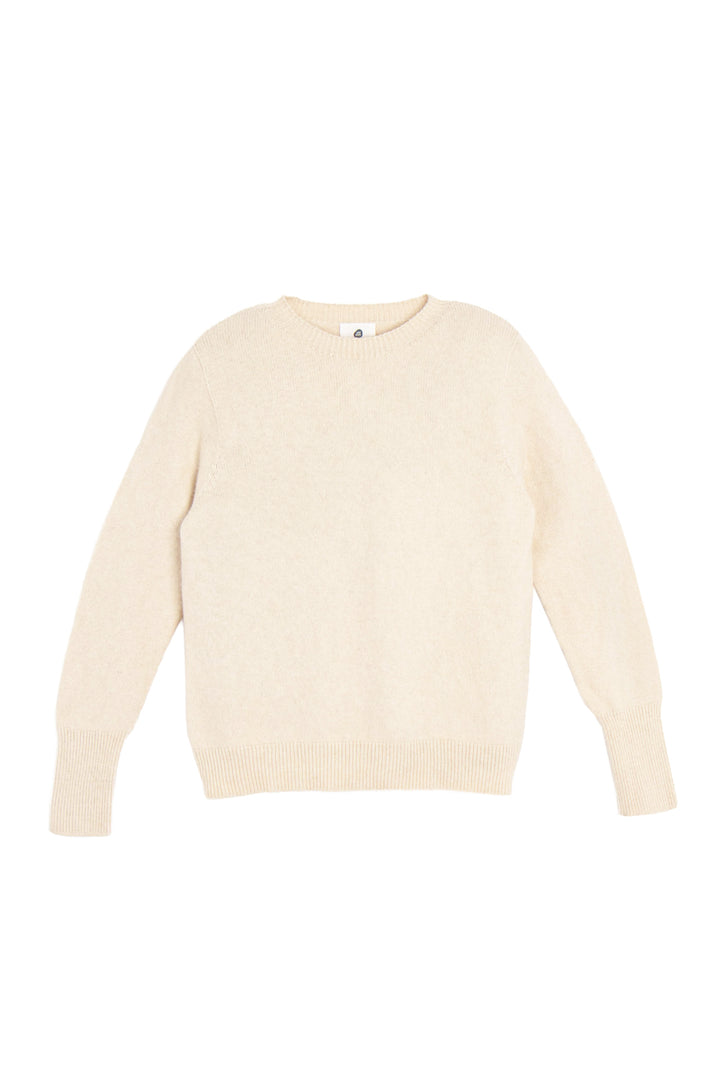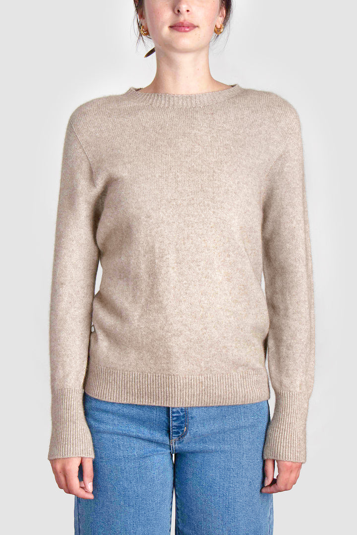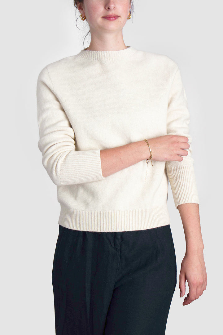 The silhouette is gently contoured, with a classic crew neckline and subtle detailing: 2x2 rib trims at the collar, cuffs, and hem, and extended sleeves for a touch of sophistication. Understated and versatile, it transitions effortlessly from relaxed moments to polished ensembles.