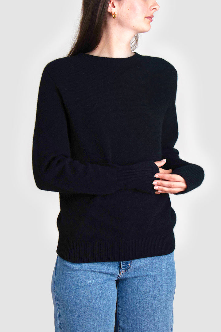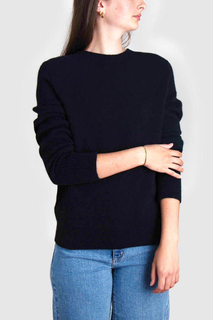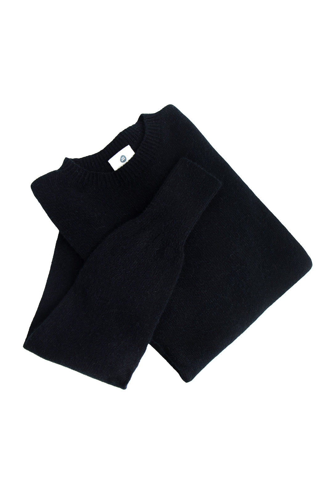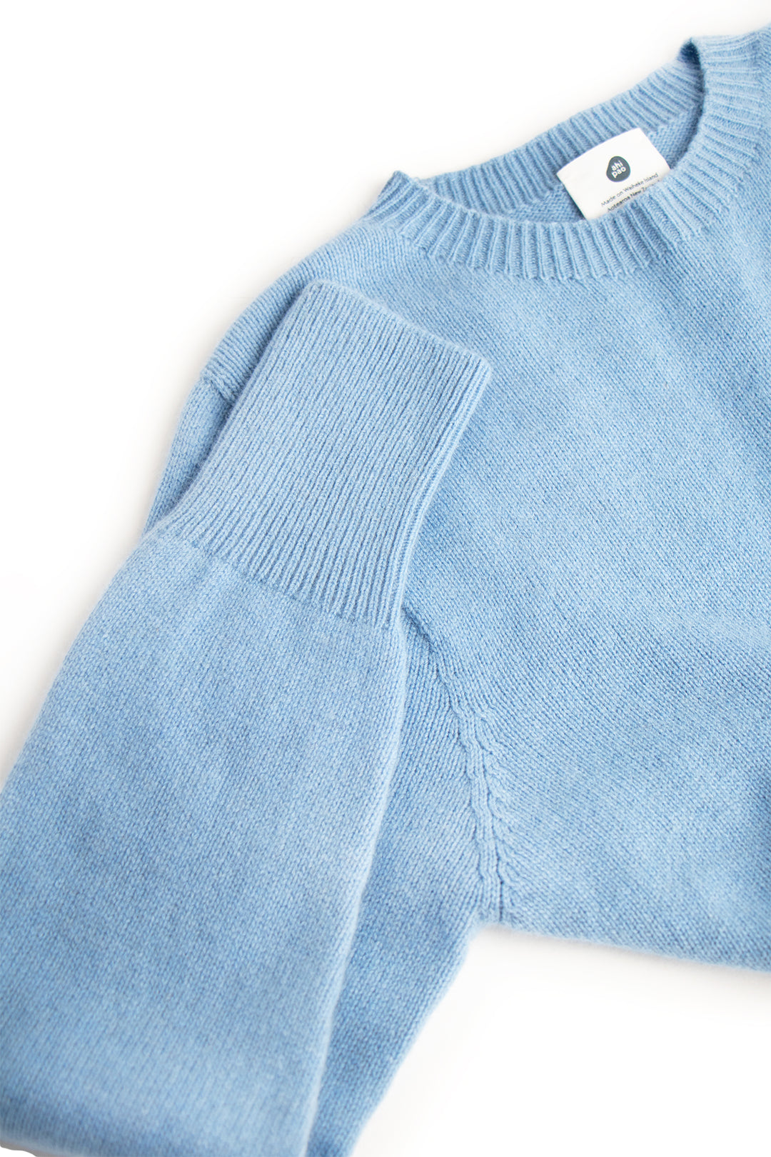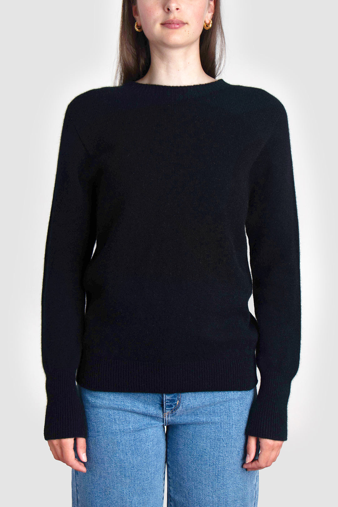 The silhouette is gently contoured, with a classic crew neckline and subtle detailing: 2x2 rib trims at the collar, cuffs, and hem, and extended sleeves for a touch of sophistication. Understated and versatile, it transitions effortlessly from relaxed moments to polished ensembles.