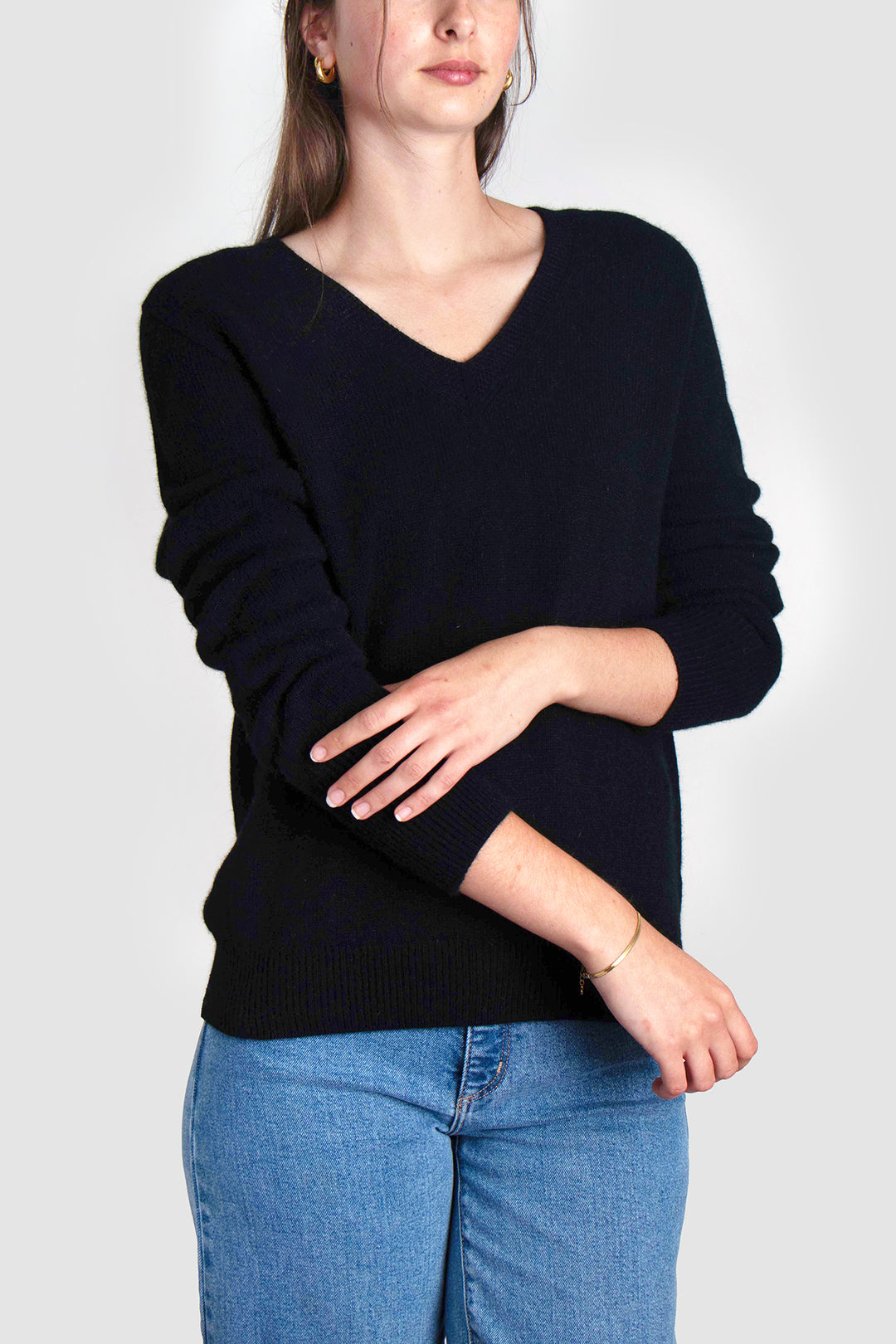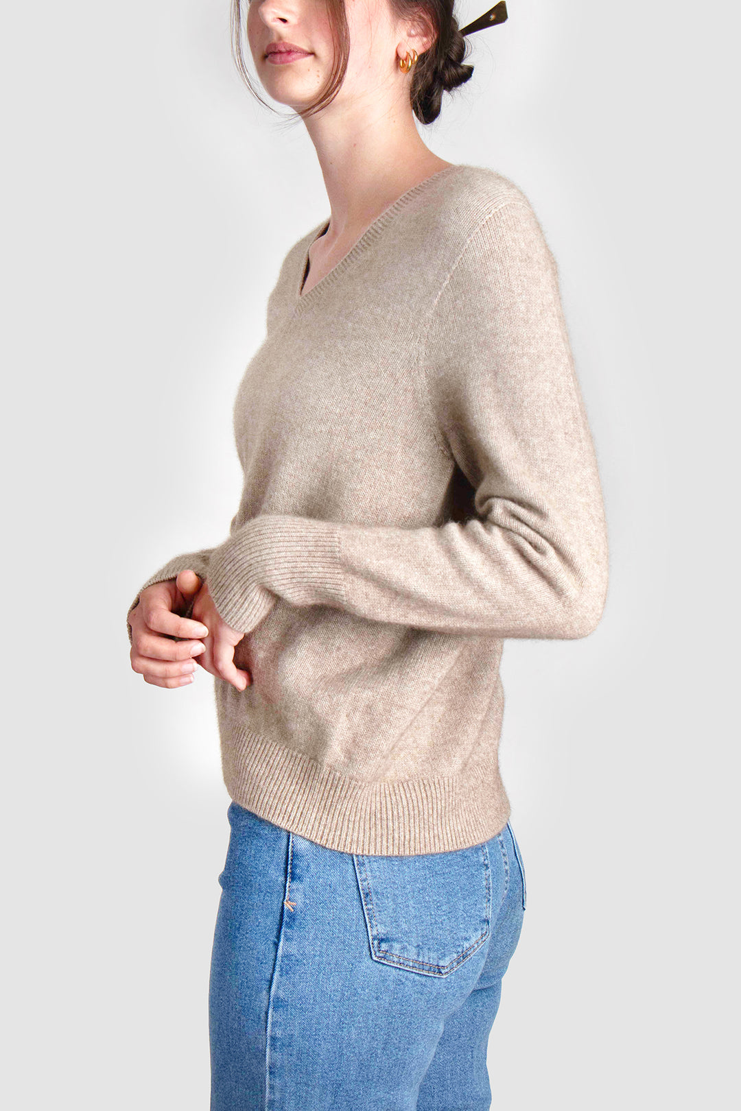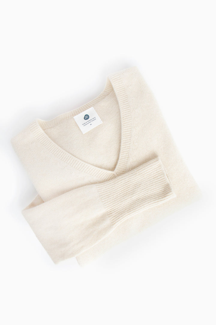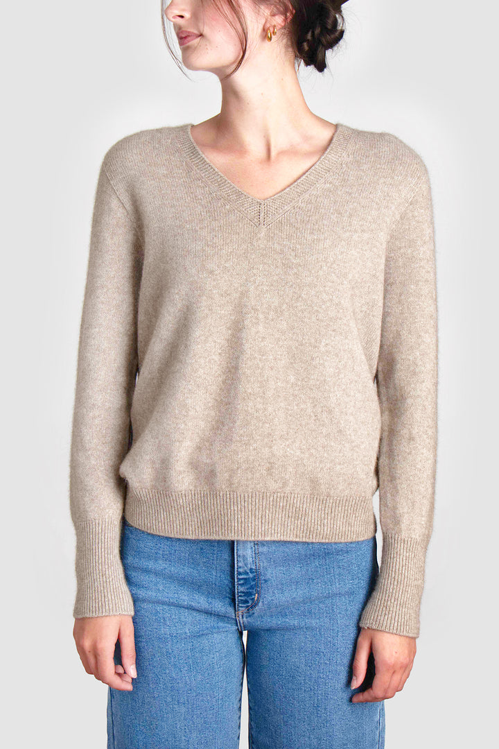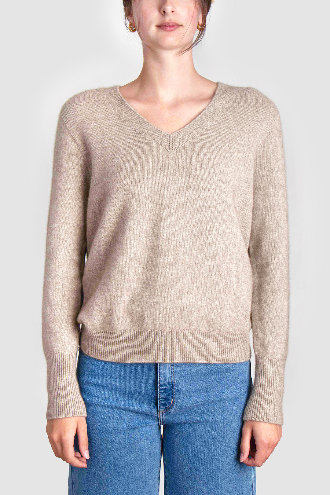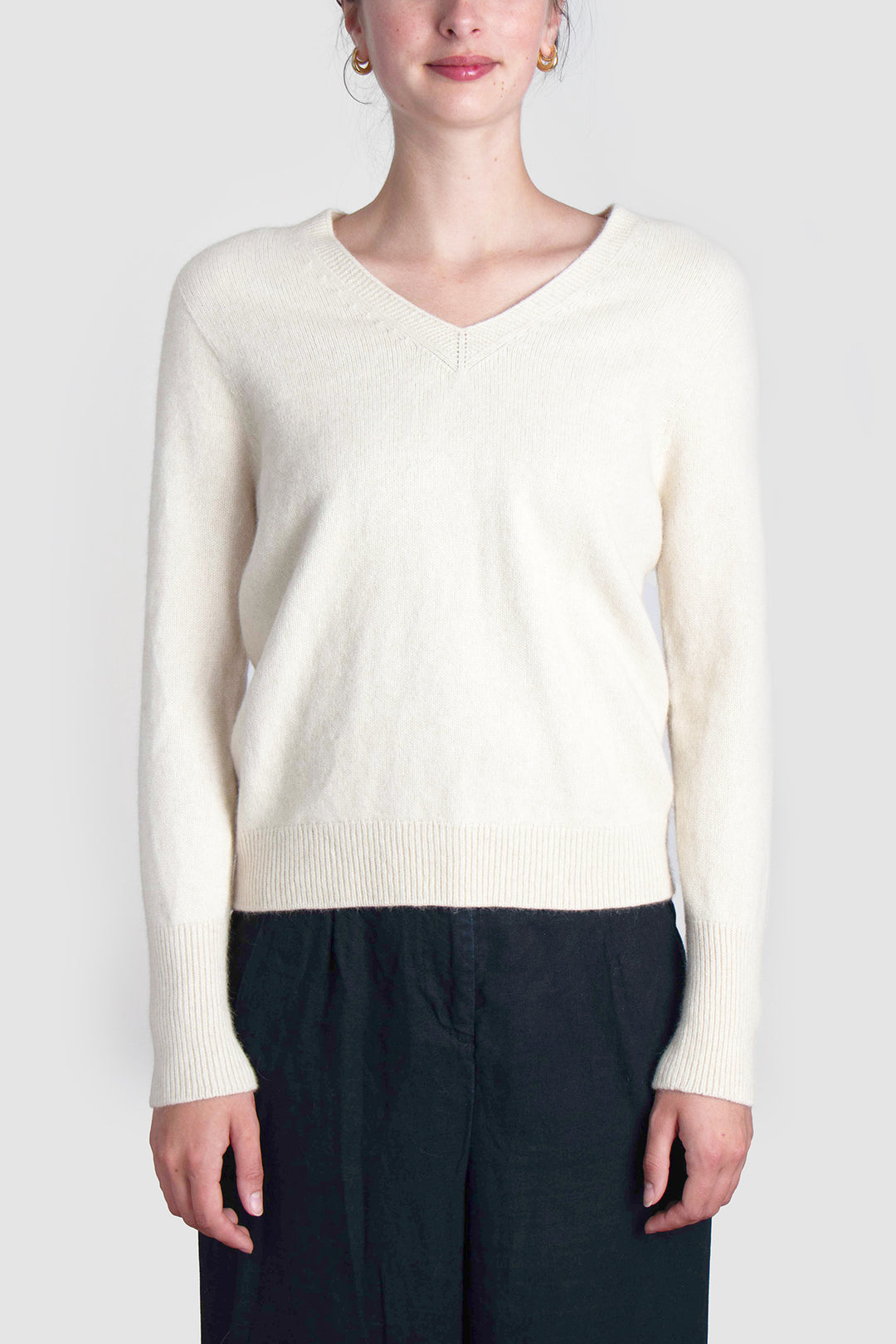 The neckline dips into a clean, refined V, complemented by delicate 2x2 rib detailing at the hem, collar, and extended cuffs—subtle touches that speak volumes. Understated yet polished, this jumper is a versatile foundation piece, equally at home layered or worn solo.