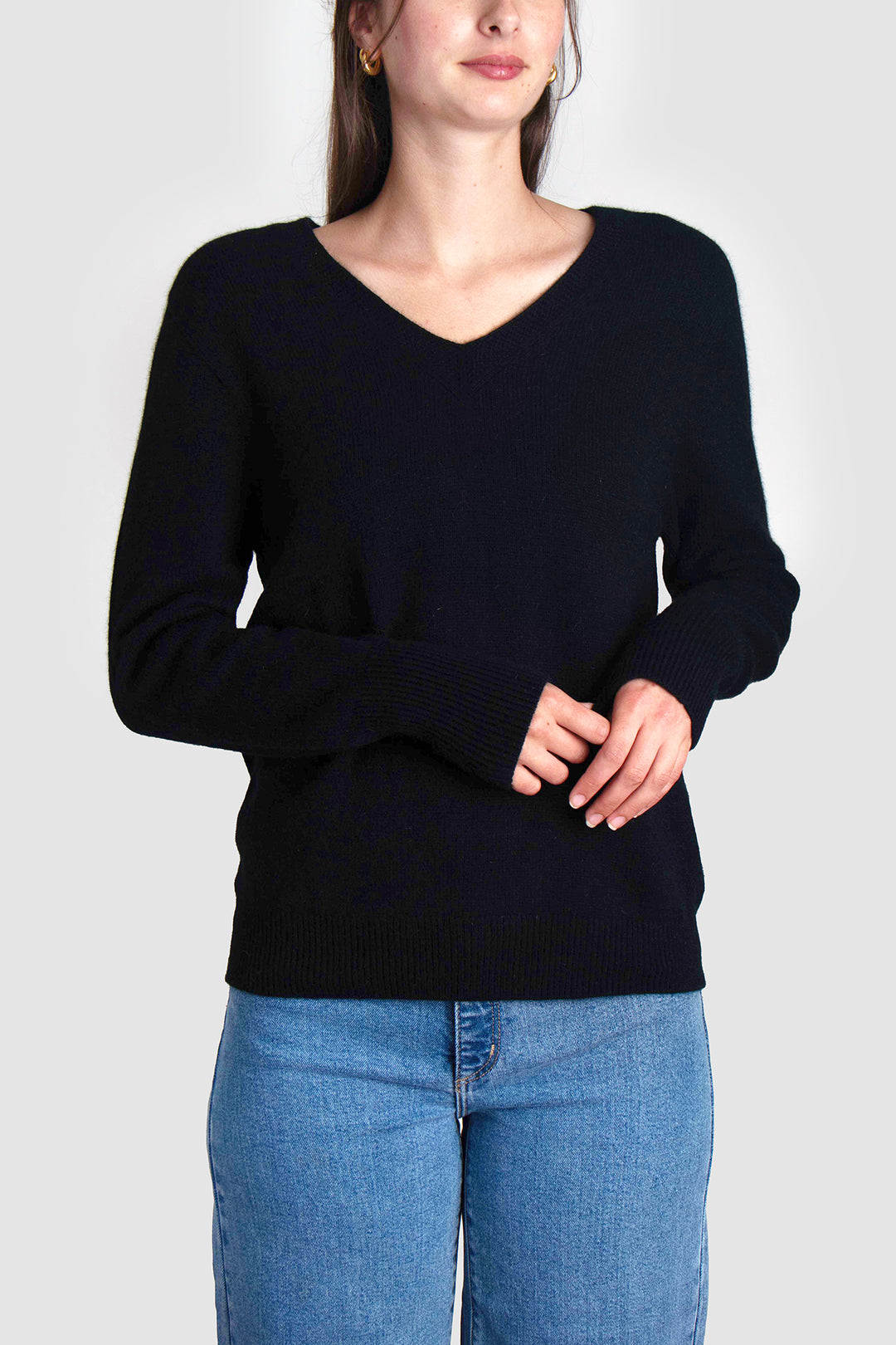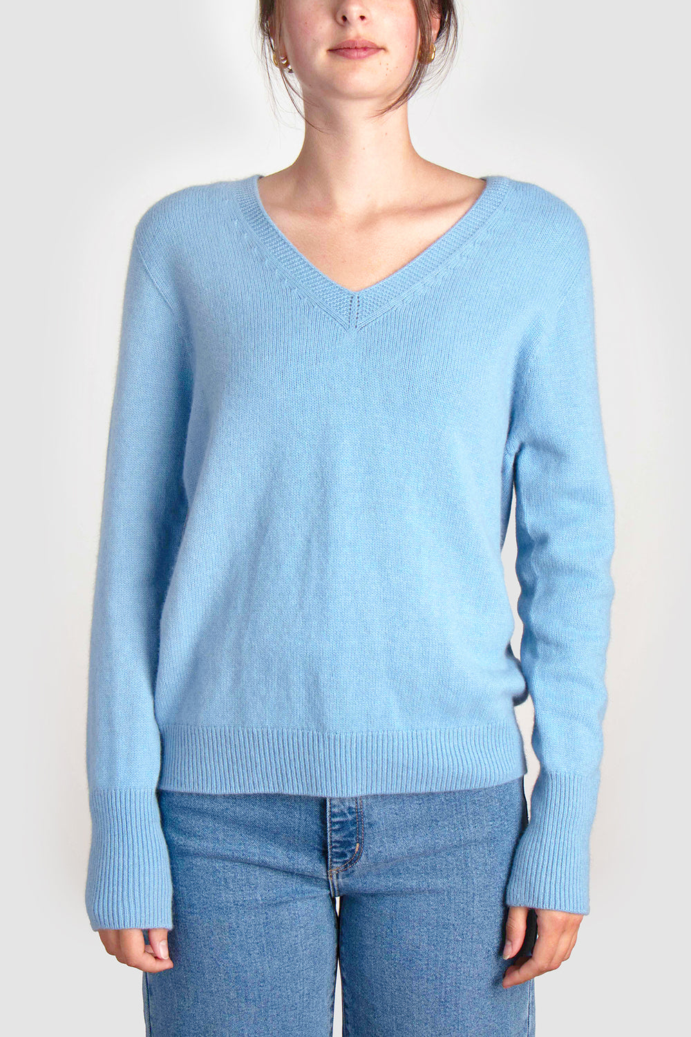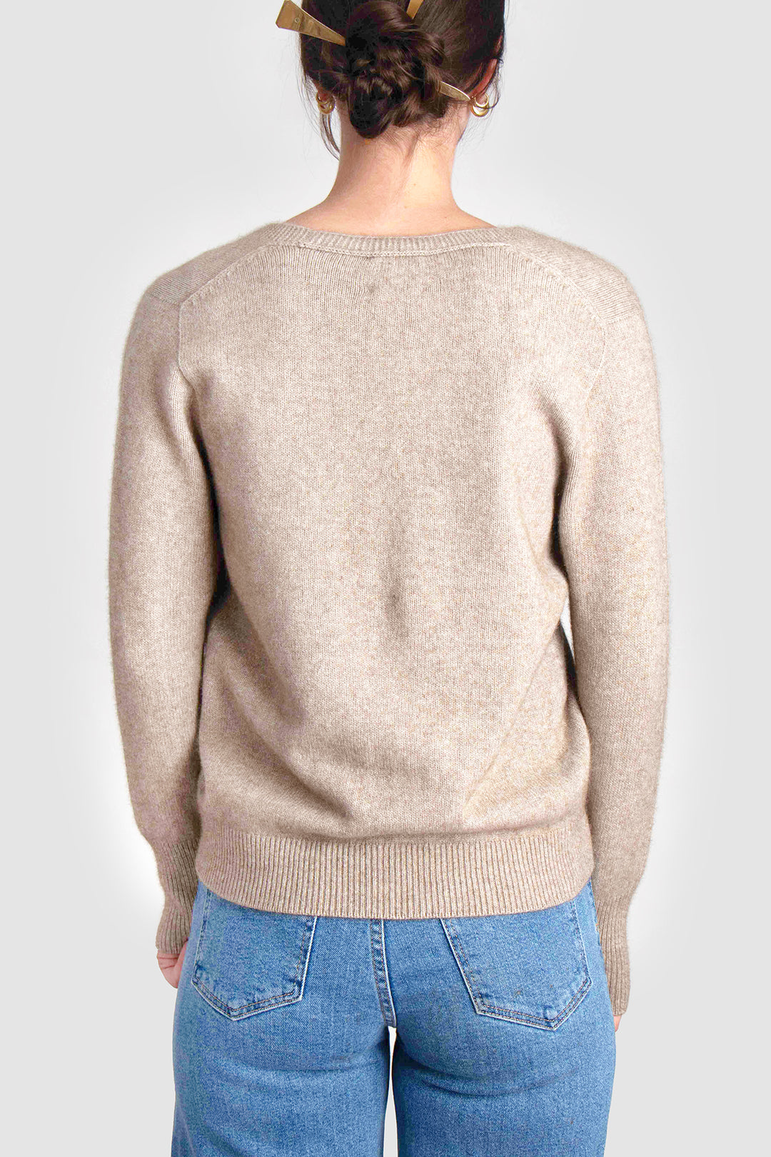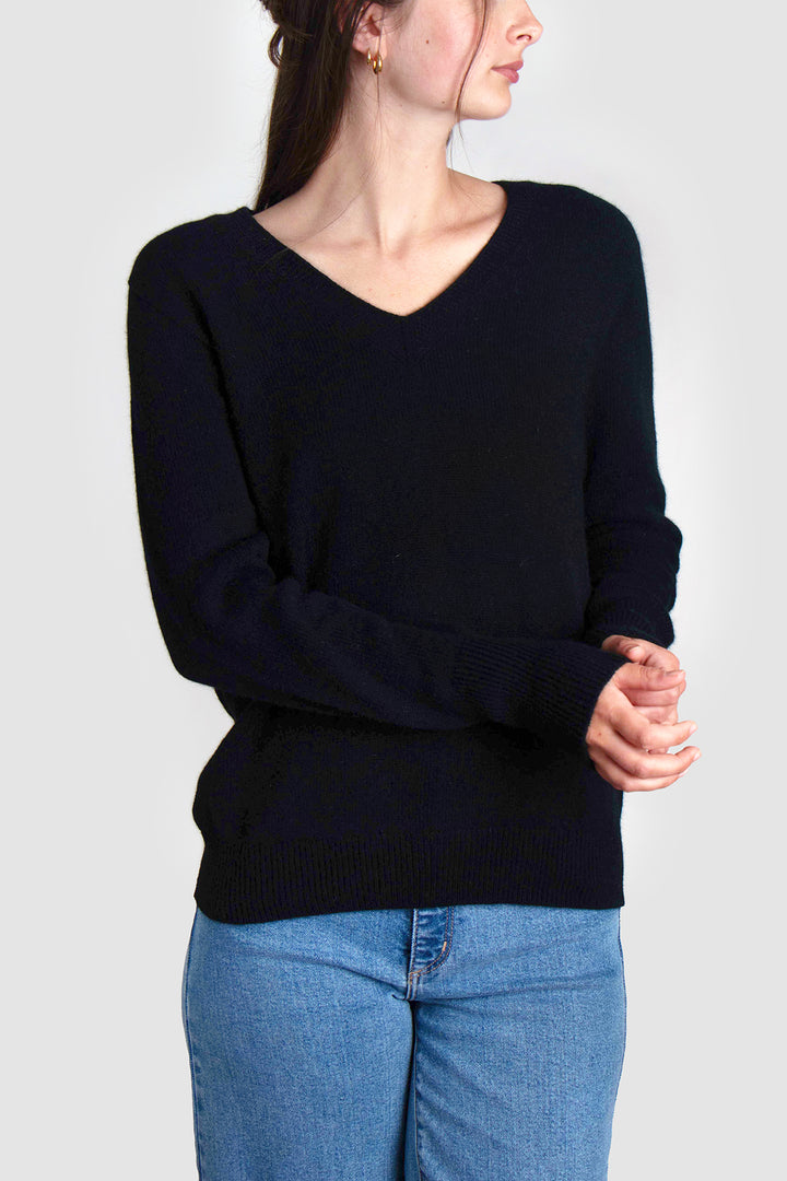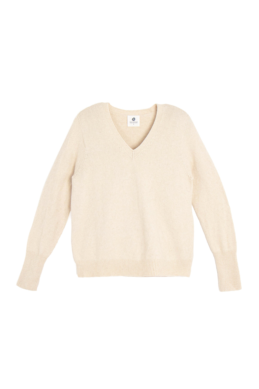The neckline dips into a clean, refined V, complemented by delicate 2x2 rib detailing at the hem, collar, and extended cuffs—subtle touches that speak volumes. Understated yet polished, this jumper is a versatile foundation piece, equally at home layered or worn solo.
