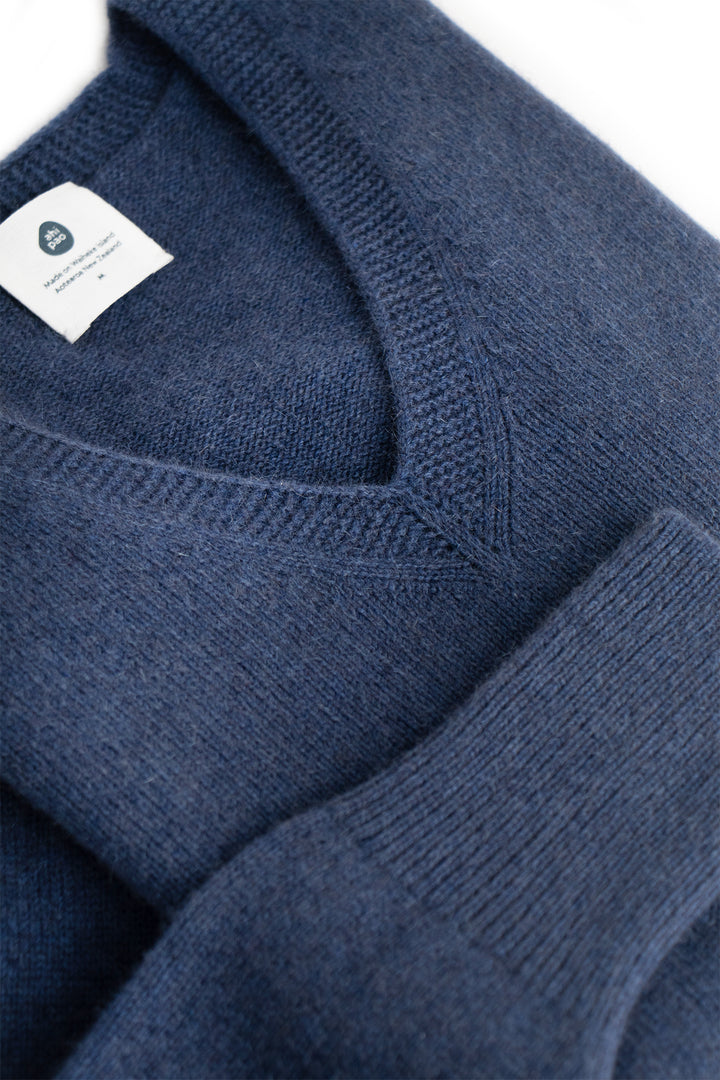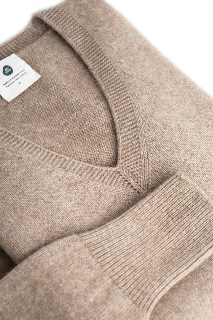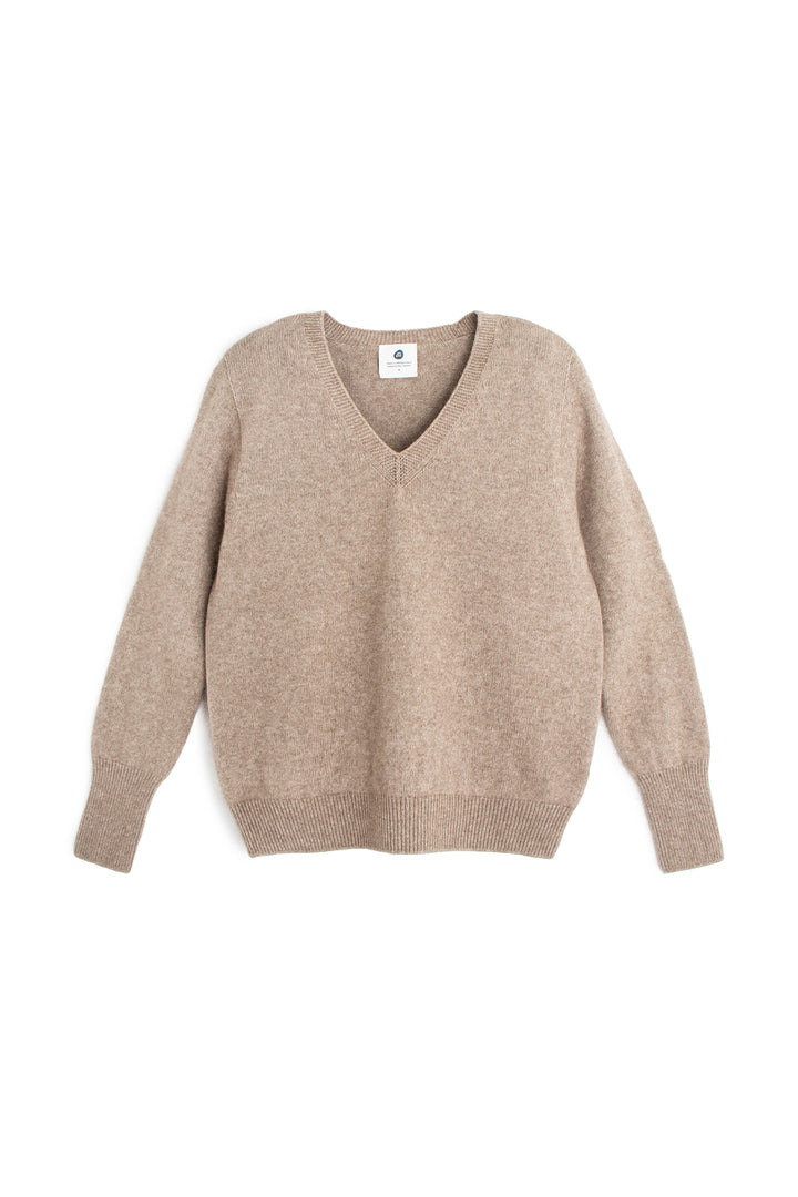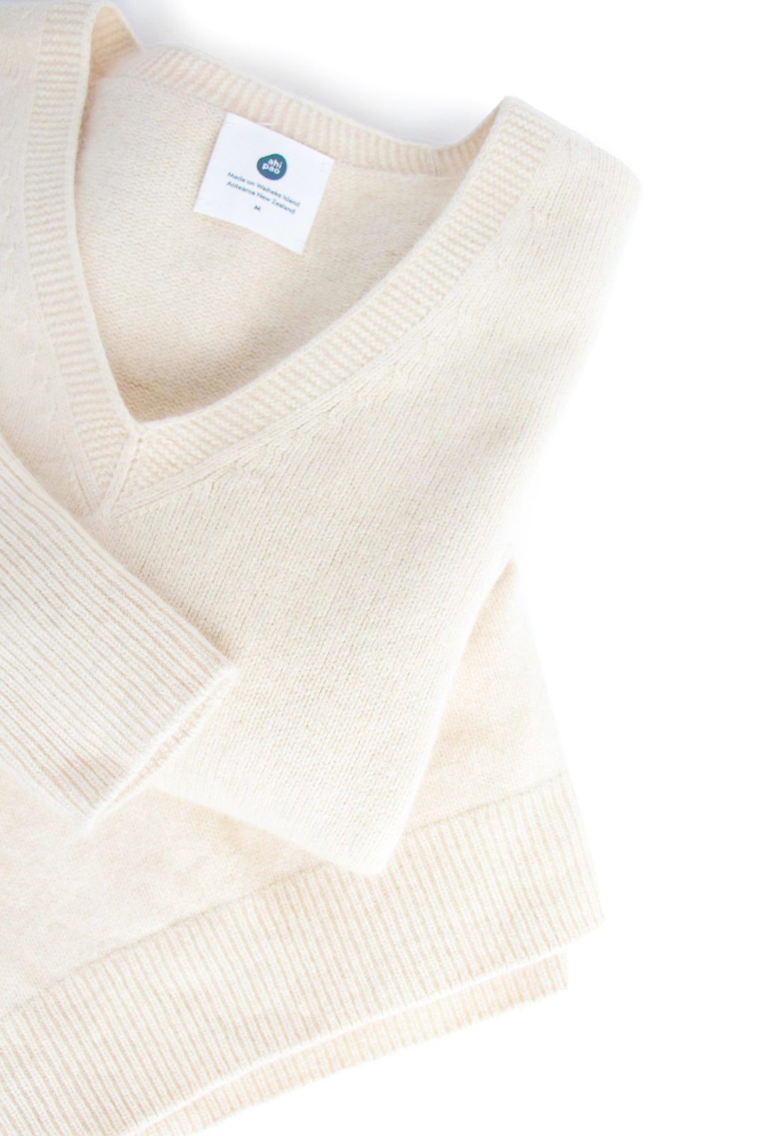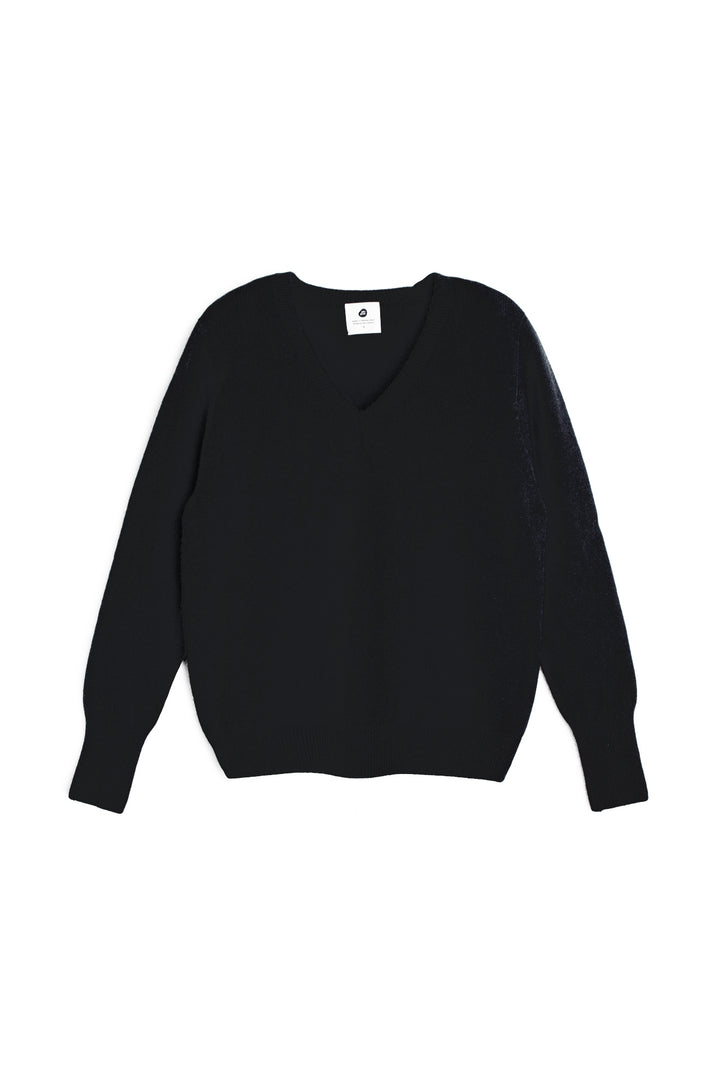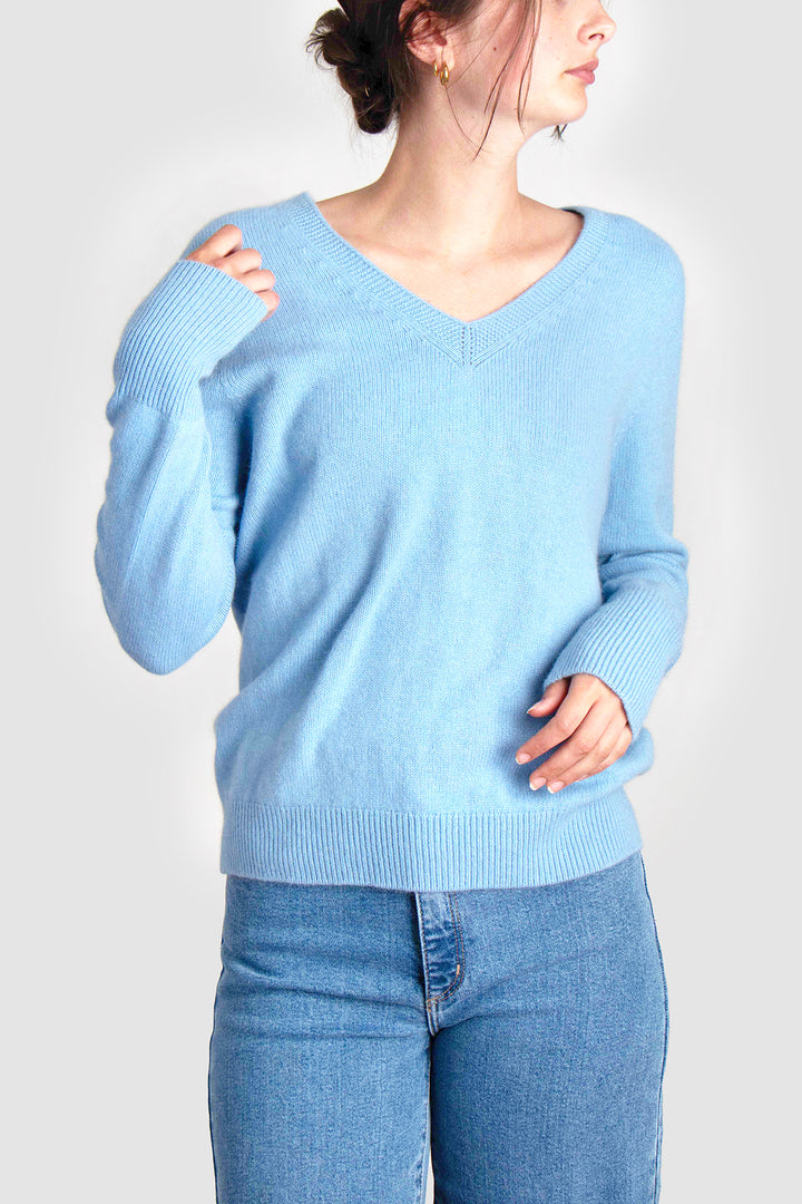 The neckline dips into a clean, refined V, complemented by delicate 2x2 rib detailing at the hem, collar, and extended cuffs—subtle touches that speak volumes. Understated yet polished, this jumper is a versatile foundation piece, equally at home layered or worn solo.
