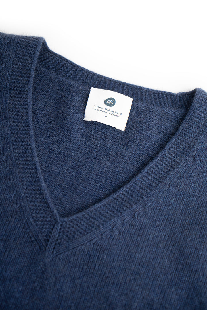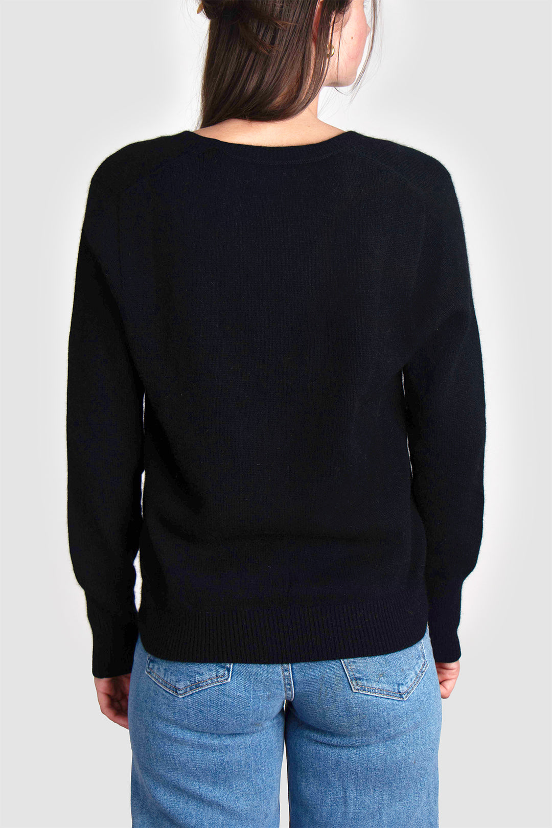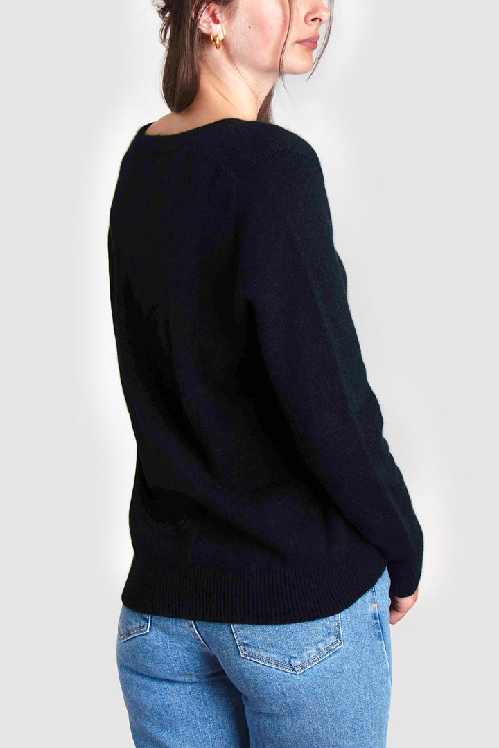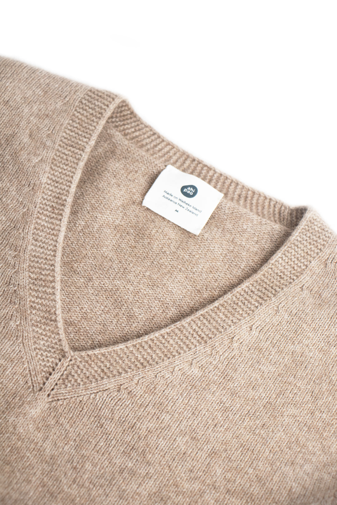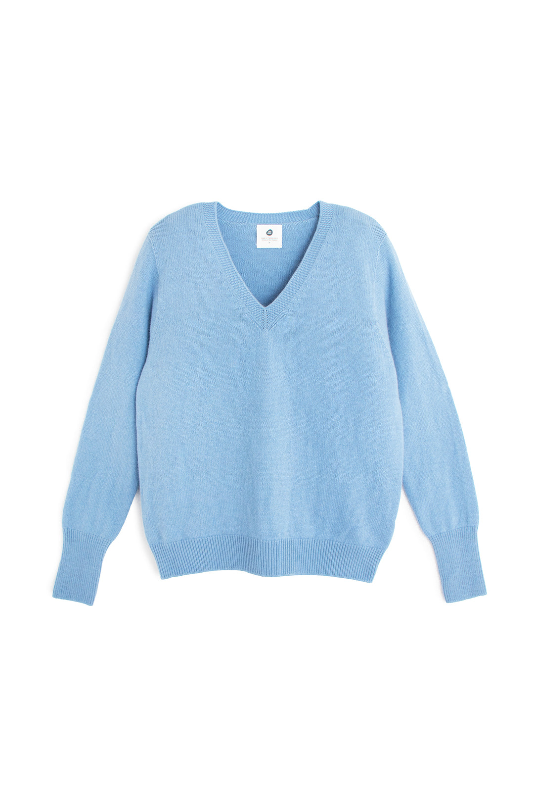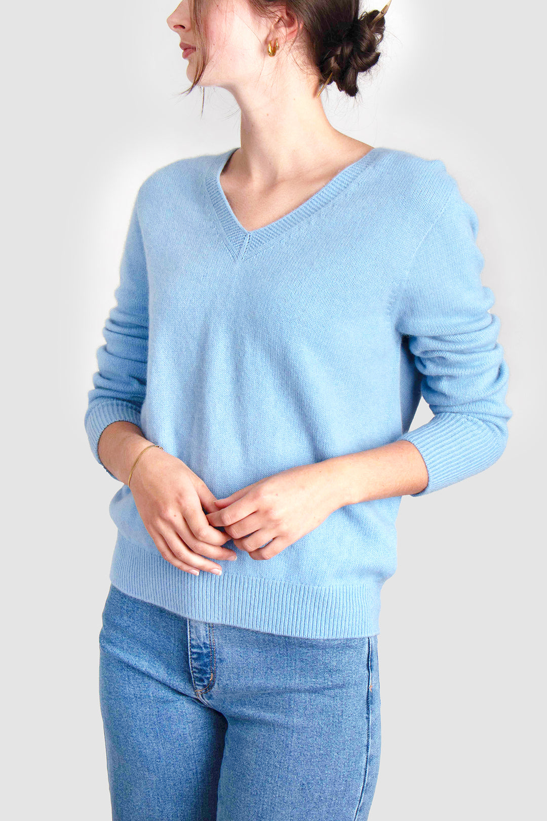 The neckline dips into a clean, refined V, complemented by delicate 2x2 rib detailing at the hem, collar, and extended cuffs—subtle touches that speak volumes. Understated yet polished, this jumper is a versatile foundation piece, equally at home layered or worn solo.