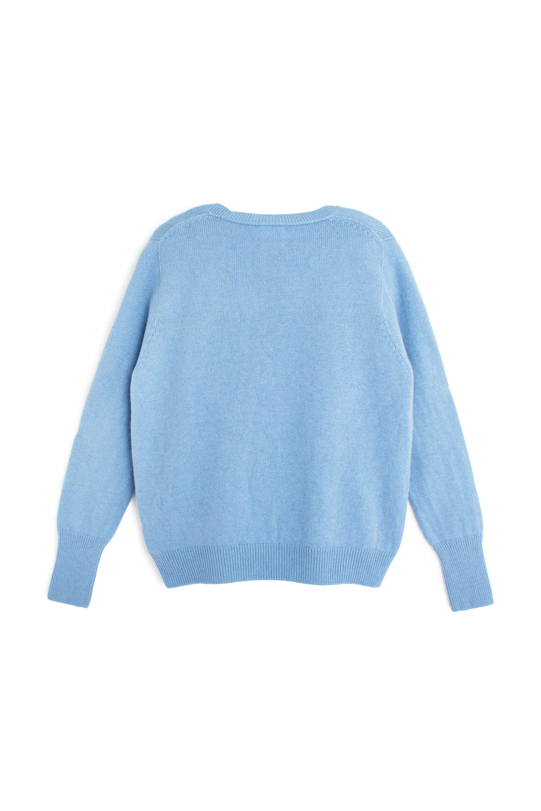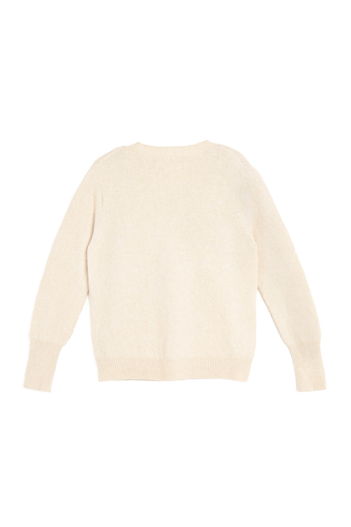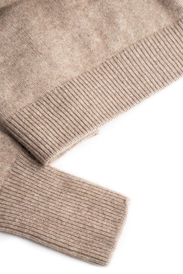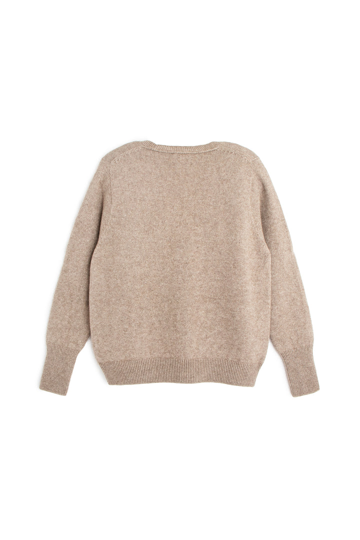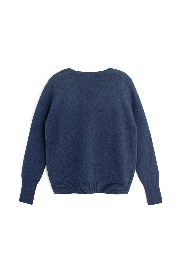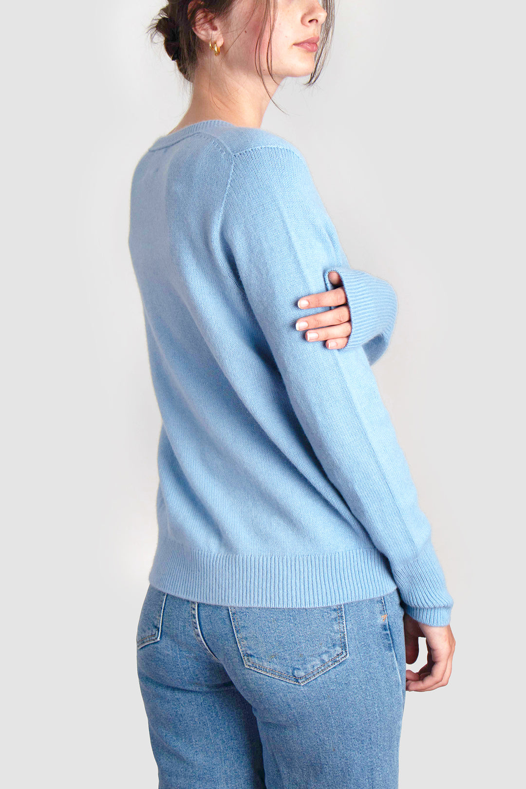 The neckline dips into a clean, refined V, complemented by delicate 2x2 rib detailing at the hem, collar, and extended cuffs—subtle touches that speak volumes. Understated yet polished, this jumper is a versatile foundation piece, equally at home layered or worn solo.