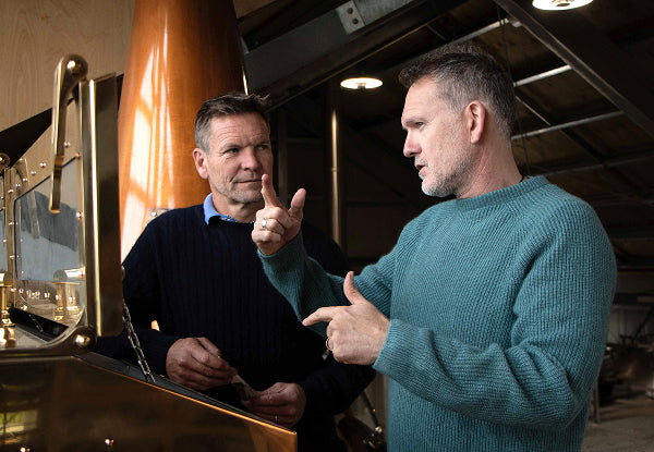 For this photoshoot, we brought the two Marks - Mark Izzard and Mark Hindmarsh - together for a morning of conversation and exploration at the Waiheke Whisky distillery. As longtime islanders, their chat wandered easily from distilling to daily life to the hopes they share for what’s still to come. Both wore pieces from our Cirrus collection - our Mens Cirrus Cable Crew and Mens Cirrus Fisherman Rib Crew Neck — garments designed for cool mornings, quiet focus, and the kind of understated utility that fits right into the rhythms of island life.